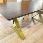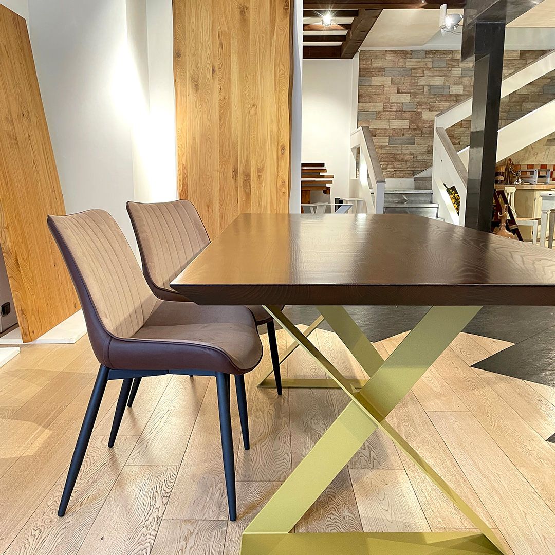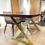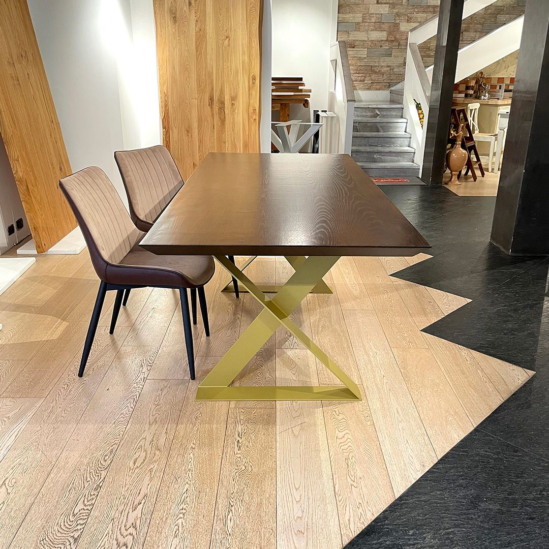 Tavolo in legno massello di castagno con gambe Xold di colore personalizzato oro. Il tavolo, realizzato in finitura noce scuro, è caratterizzato dai bordi a 45°. Il risultato è un tavolo moderno ed elegante.
