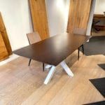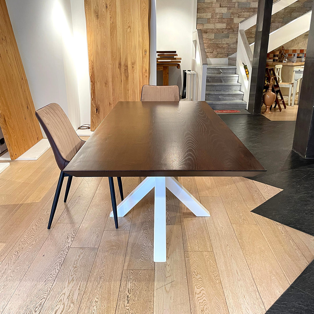 Tavolo in legno massello di castagno finitura noce scuro. Il tavolo è caratterizzato dal bordo a 45° e gambe a Stella di colore bianco.